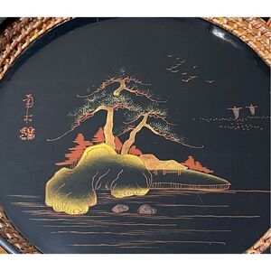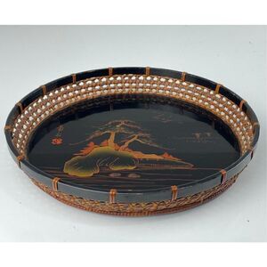 Vintage Japanese Lacquered Hand Painted Wooden Tray with Wicker Sides