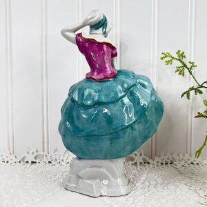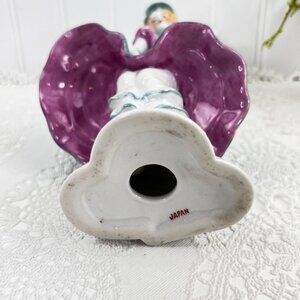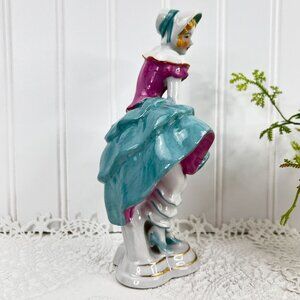 This vintage Japanese figurine captures the elegance of a bygone era. Featuring a lady with a charming hat and intricate ruffled dress, it showcases exquisite craftsmanship and detail. The vivid colors and graceful posture reflect a classic aesthetic, making it a captivating piece for any collector or admirer of vintage decor.