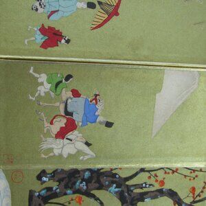 Enhance your decor with this beautiful vintage Japanese miniature four-panel folding screen. A classic piece of decorative art, this tabletop byōbu tells a story across its panels, making it a captivating display item for any shelf, desk, or mantel.