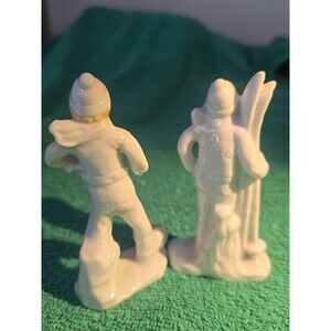 The product is a set of 2 vintage Japanese porcelain skier figurines, each standing at 4.5 inches tall. These white figurines feature a skiing theme, perfect for winter sports enthusiasts. Made of porcelain, they add a unique touch to any collection or decorative display. The detailed design captures the essence of skiing, making them a charming and nostalgic addition to any home.