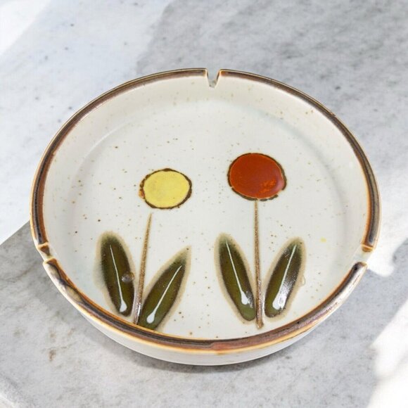 Vintage Japanese Pottery Round Speckled Ashtray Dish Bowl Abstract Flowers Vtg