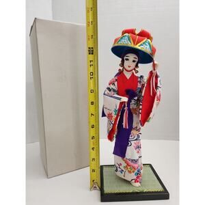 Elegant vintage Japanese Ryukyu Geisha doll, standing approximately 14 inches tall. This beautiful doll is dressed in a traditional kimono with intricate detailing and vibrant colors, representing the artistry and culture of the Ryukyu Islands.