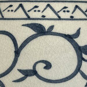 Beautiful vintage Japanese sake set with one bottle (tokkuri) and matching cup (ochoko). Hand-painted in classic blue-and-white with a vine scroll design and rustic crackle glaze. Both pieces are marked with the maker’s seal.