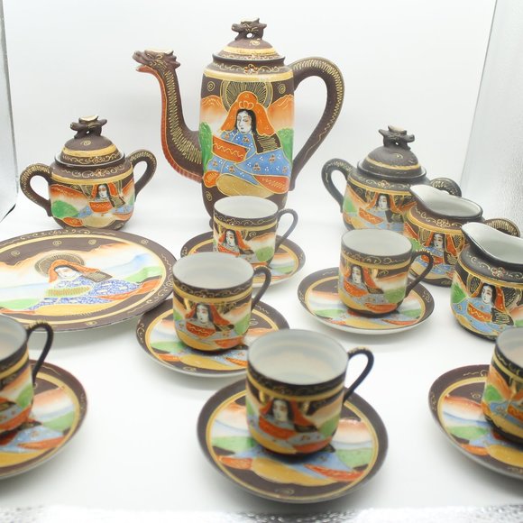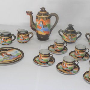 Vintage Japanese Set Porcelain Moriage, Geisha Dragonware Tea Set 21 pc, Hand paint