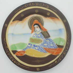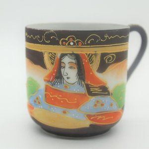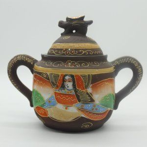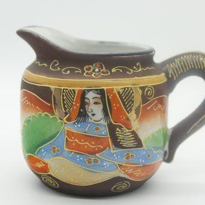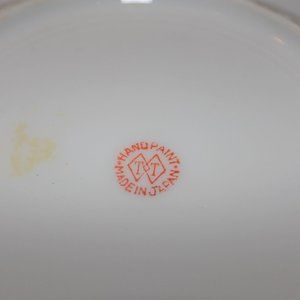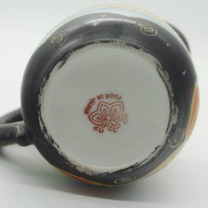 In brown and orange with multicolor accents and gold trim. Made in Japan. Coffee/Chocolate pot, sugar & creamer, with 6 small cups and saucers, 1 cookie plate, and an extra set of sugar 7 creamer in a darker brown.