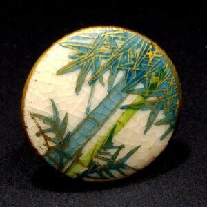 *Description: This is a vintage pair of Japanese satsuma bamboo ceramic circles attached to screw back earrings from the early 1900s. The ceramic earrings are hand painted and a special glaze forms a crackle appearance. Much of the painting is outlined in gold strokes. The earrings are signed JAPAN on the back of each earring. They held securely, but with age, the glue turned yellow. The glue does not show when worn. They would be a great addition to your vintage jewelry collection, or make a great vintage gift!