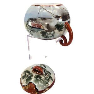 This intricately designed vintage sugar bowl features traditional Japaneselandscape art scene with geishas with vibrant hand-painted details. The porcelain piece showcases elegance and cultural artistry, making it a sophisticated addition to any collection. Its durability and timeless beauty make it an appealing choice for collectors and enthusiasts of fine porcelain.