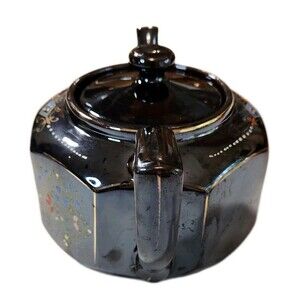 Vintage Japanese Teapot Brown Glazed Gold Trim Hand Painted 8 Sided Ceramic