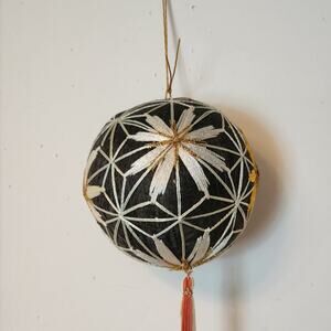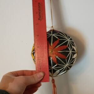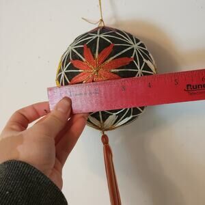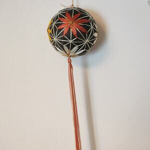 Vintage Japanese Temari Ball Black Red Gold Embroidered Silk Thread Ornament