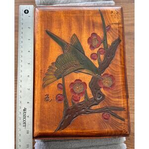 A high-quality vintage Japanese wooden box featuring a hand-carved uguisu bird (bush warbler) and plum blossom design, highlighted by the natural wood grain, an urushi finish, and detailed carving. The craftsmanship shows the time and care the artisan put into this piece, giving it a personal and warm feel. Beautiful as decor and also practical for storing letters or small items.