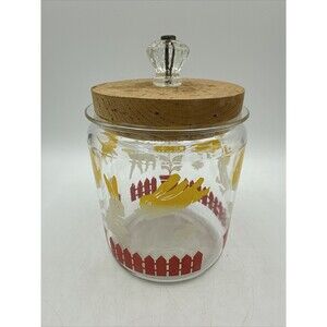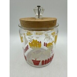 Vintage Anchor Hocking Glass Biscuit Jar Canister Bunny Lamb Duck Tulip 1940s. The lid is handmade and not the original. The lid is made of wood with a glass knob/handle. The jar has no damage such as cracks or chips. The jar itself stands 5 inches tall - with the lid/handle its 7 inches tall. The jars diameter is 4.75 inches. Lid fits loosely on jar--not airtight. Shipped with great care. Thank you for viewing this item and visiting my closet!
