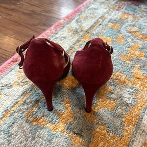 Step out in style with these elegant red suede heels with a dainty gold chain. Perfect for any occasion, these shoes offer both comfort and sophistication.
