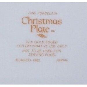This is a vintage Jasco fine porcelain Christmas plate made in 1982. It features a beautiful 22 karat gold edge.