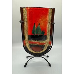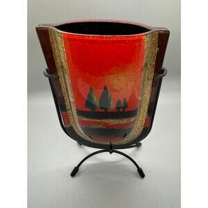 Vintage Jasmine Art Glass Vase in Metal Stand Black Gold Red Green Trees Vibrant