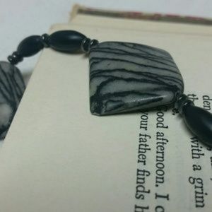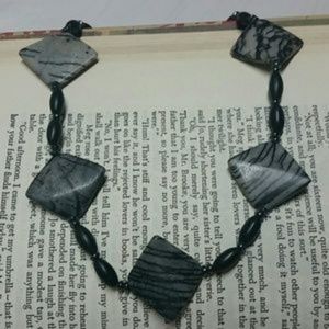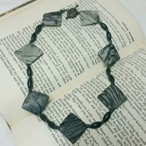 Obsessed with everything Black and Grey like me? Then this beautiful Jasper necklace is the one for you! It is good vintage condition! One chip as shown in the last picture.