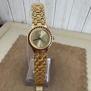 Vintage Jaz Paris French Designer Gold 18K gold plated Watch with red Cubic Zirconia CZ Bezel 7.25 inch long Link Bracelet Stainless Steel Back JZ0062