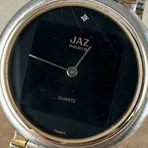 The Vintage Jaz Paris French Designer Watch boasts a small diamond and an 18K gold-plated two-tone design, featuring a yellow gold and stainless steel link bracelet with a stainless steel back, model W7 5M79. Although pre-owned and lacking the original box or tags, it remains in good working condition. This timepiece features a black dial with a square inner design and a small diamond at the 12 o'clock position, complemented by gold hands. The mineral glass crystal has minimal scuffs, and the 1.25-inch diameter case is adorned with 18K gold electroplated bezel accents and bars on the bracelet. Crafted in France, it incorporates a high-quality Japanese movement, spans 7.4 inches in length, and the bracelet is 3/4 inch wide. The back side, which had light pitting, has been refurbished. The mineral crystal bears slight scratches, visible in the pictures. Dating back to the 1990s, the watch has received a new battery and undergone sanitization, servicing, and cleaning. For further details, please refer to the pictures.