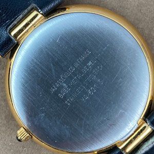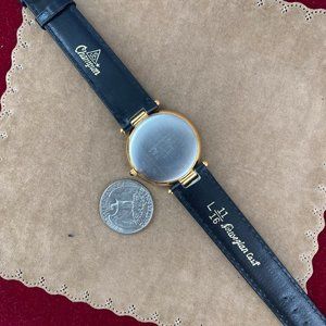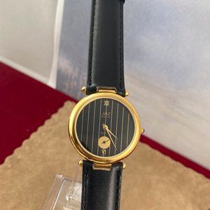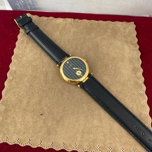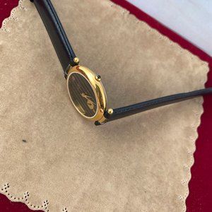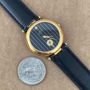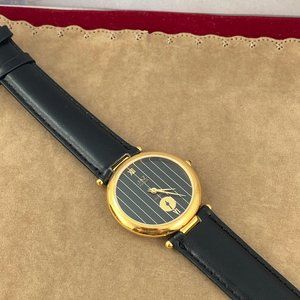 New perfect working order, Beautiful Black and Gold Striped Dial, Gold Accents and Hands and Accents, Roman Numerals. second hand.The crystal is mineral glass light scuff at 1. The 1 1/4inch Diameter case is 10 Micron gold plated with Onyx Crown. Assembled in France with a high quality Japanese Movement has a 10 inch Black T Lug Norwegian Calf Leather Strap. see pictures Stainless steel Back YA6Q133 New Battery