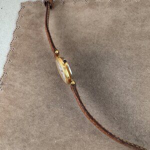 This watch is Pre Owned, perfect working order, new battery fitted and immaculate condition. Beautiful White Dial, Gold Accents, Gold Hands with Black Tips, and Roman numeral hour markers. The crystal is mineral glass and scratch Free. The 7/8 inch watch case is 10 Micron gold plated with a Onyx cabochon crown and fancy "T" lugs for the strap. Assembled in France with a high quality Japanese Movement. 7.5 inch Brown Leather Strap shows use.