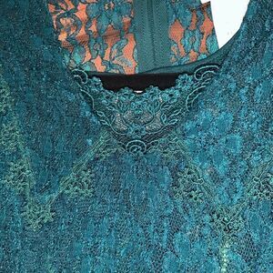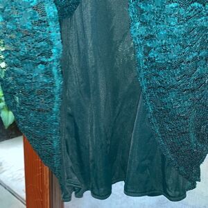 Sheer dark green lace dress with green nylon slip dress underneath. Lace trim collar, 3/4 sleeves with small gathered puckering. High lace tie back waist. Long zipper back. Fabric has some stretch. Excellent vintage condition. No flaws noted. Big girls size 10.