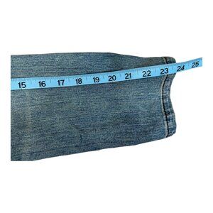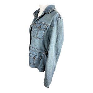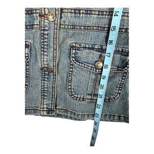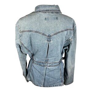 This is a fitted jean jacket with cinch sides and a pleated back. Front pockets and a button front closure.
