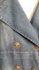 Classic Vintage, denim, blue, button closure, double breast, lower button tab on back of jacket, welt side pockets, wrist button straps, wide collar, breast flap, lightweight , classic button logo upward curve round hem, glow stitching, cossack, gently used, size large.