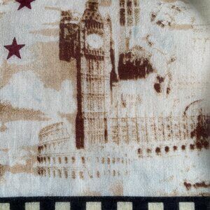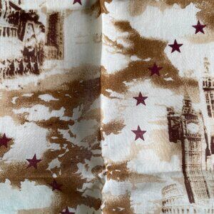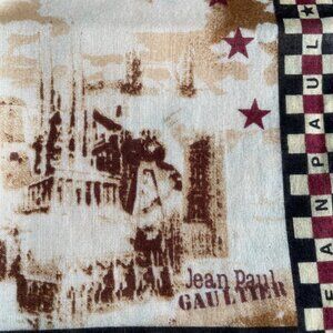 This rare vintage Jean Paul Gaultier cotton scarf features a sepia-toned architectural cityscape layered with burgundy stars and framed by a bold checkerboard border that spells out the designer’s name. Unique, artistic, and unmistakably JPG, this piece captures the avant-garde aesthetic of the era.