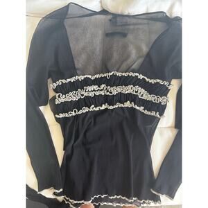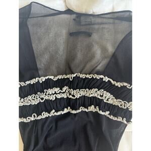 • Sheer black mesh base with contrast ivory ruffle detailing across bust and hem