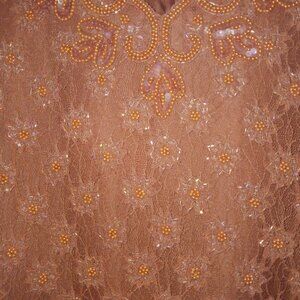 Pit to Pit 20inches. Dress length 51 inches. Dress hem gently asymmetrical with the sides being longer by 2inches from the middle. Tea length. Lovely blush rose color. All beads intact. Photos don't do it justice. The beads look orange in photo but they are like pink pearls. 1980s/1990s.