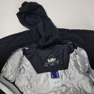 This is a vintage Jean-Claude Killy ski suit in black, size 40. It is a rare anniversary edition numbered 27 of 185, featuring a long length with long sleeves and a zip closure. The ski jacket has a belted waist and a hidden mask, suitable for skiing in cold weather. Made of 100% polyester, it is a unisex adults snowsuit with a regular fit, perfect for ski enthusiasts.