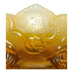 Gorgeous Jeanette fruit bowl manufactured in the 1940’s. Beautiful pattern and seamless amber glass.