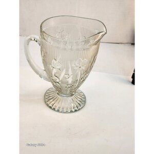 This vintage clear glass pitcher features an intricately etched floral design, complemented by a ribbed pattern. Ideal for elegant serving, its sturdy handle ensures ease of use, while the broad base offers stability. A beautiful addition to any glassware collection.