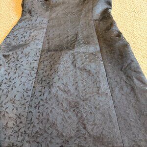 Jacquard Leaf Pattern. Black on Black Design. Lined. A-Line. Knee Length. Spaghetti Straps. Back Zipper Closure. Hook & Eye Topper.
