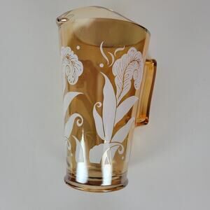 Vintage Jeanette Carnival Glass Marigold Feather Pitcher 9" tall Amber Peach