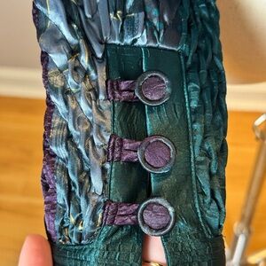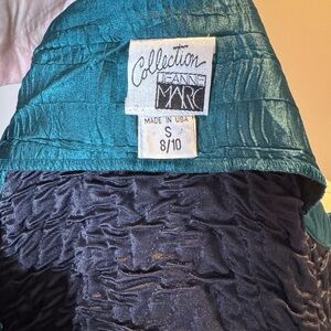 Make a bold statement with this vintage Jeanne Marc women’s jacket in size Small. Known for their vibrant color palettes and artistic textile work, Jeanne Marc pieces are highly collectible and instantly recognizable. This jacket features a rich woven texture with shades of teal, purple, and deep blue, accented by teal trim and six fabric-covered buttons.