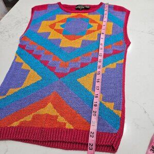 tags; Bohemian, Embellished, Festival, eclectic, boho, hippie, artsy, cottagecore, retro, Y2K sweater, 70's, 80's, 90's, ramie sweater, vintage ramie sweater, tank top sweater, sleeveless sweater, colorful, statement piece, aztec, primary colors,