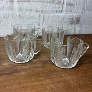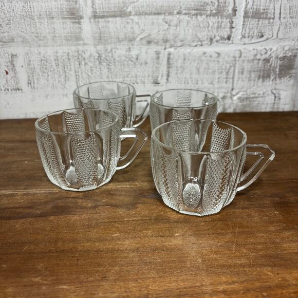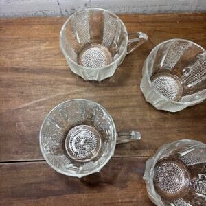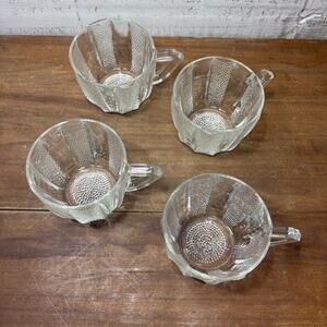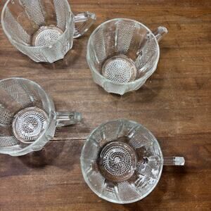 Set of four glass cups with handle, dewdrop pattern glass by Jeannette Glass, 2.5” tall, 3” diameter