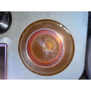 Jeanette Marigold Sunburst is the pattern maker. I have a huge platter. It is that pattern. It is vintage. It is absolutely stunning. Gold looks like Sunburst. No flaws no chips no cracks. No loss of color. Some kind of crinkly defect in the glass. This is an absolutely gorgeous plate.