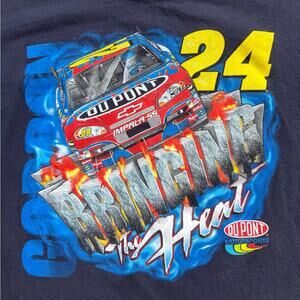 Vintage Jeff Gordon NASCAR youth t-shirt by Chase Authentics. Size medium (10/12), 100% cotton, made in Nicaragua. Features bold front and back graphics with the #24 Dupont Chevrolet Monte Carlo, “Bringing the Heat” and “Scorching the Competition” slogans. Classic 2000s NASCAR fan gear with bright, collectible all-over print.