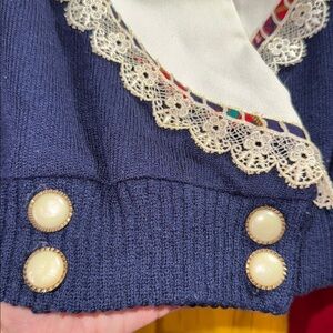 Vintage 1980s navy blue sweater featuring a stylish white collar with lace trim. Button front, attached bob, can be worn with or without, can be worn as a cardigan or closed up like a sweater, oversized collar with lace shoulder pads, great vintage piece from 80s acrylic blend cottage core style