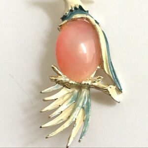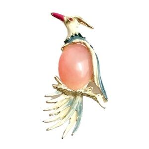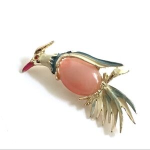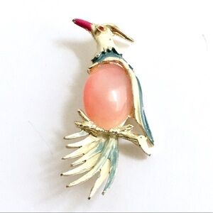 An adorable vintage bird brooch with a pink pearlescent jelly belly. I love the pastel color combo on this little guy, perfect for spring and summer.