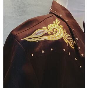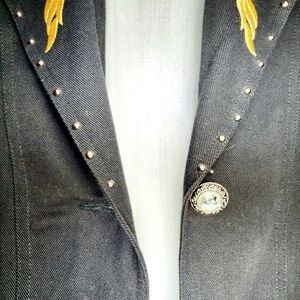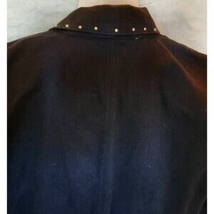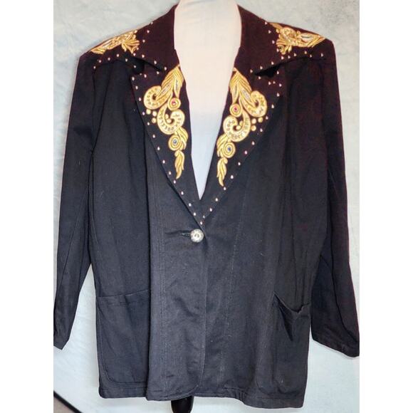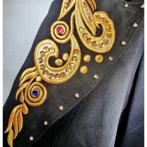 Get your glam on with gold and jewels ... but keep it casual with black denim twill. This stunning vintage, bejeweled and gold embroidered jacket also features silver studs. Made in the 1980s from Jen Jen by Darian. Long oversized blazer jacket styling in 100% Cotton. Gold embroidery embellished with golden and red colored stones with silver studs all around the lapels and collar. Notched lapels. Single crystal front button closure. 2 front patch pockets. Women's size 2X. Excellent pre-owned condition with no stains, tears or flaws that I could see. Probably could use a little ironing after 40 years in a closet, but that's all. Hand wash only.