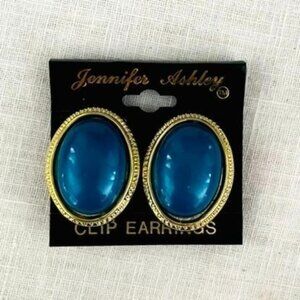 vintage earrings, 80s, 90s, 50s, 60s, costume earrings, clip-on earrings, Jennifer Ashley, blue earrings, gold-tone jewelry, retro style, oval earrings, statement jewelry, vintage fashion, classic design, gift for her, 1980s accessories