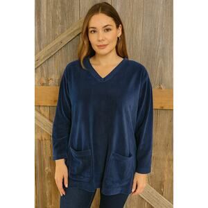 Vintage Jennifer Moore navy blue velour pocket lounge sweater comfy warm sz M oversized