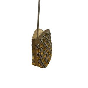 Unique gold and brown shoulder bag with an elegant woven metallic texture, slim strap, and compact size. Original design by Jenny Tee, made in the USA.