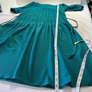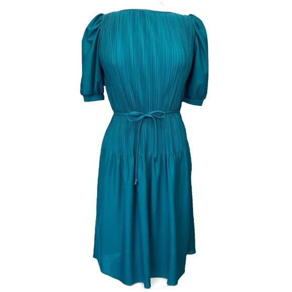 70s 80s Mid Century Accordion Glam Pinup Pleated Drop Waist Belted Dress, With 3/4 Sleeves , Boat Neck,Size in dress states 5, be sure to check measurement to verify fit. Color is a deep green. Perfect holiday dress! Light weight.