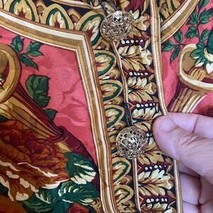 Luxurious Jerri Sherman Collection 100% silk tunic top for Gump’s, size 16. Features a rich baroque floral pattern in jewel tones, accented with ornate gold-tone buttons and side slits at the hem. Long sleeves, lightweight silk fabric, and a flowy fit make this a timeless statement piece perfect for bohemian, art-to-wear, or luxe vintage styling.