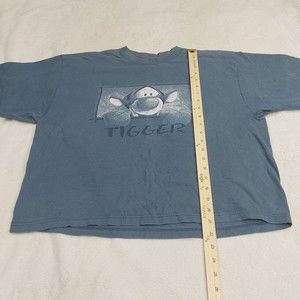 Vintage Jerry Leigh Disney Tigger Blue Graphic T-Shirt Size Large Boxy Crop-Top. Fading throughout the graphic. Shirt fit shorter and as more boxy crop-top. Two small hole on the back of the left sleeve pictured above. Please see pictures for condition and measurements for proper sizing.