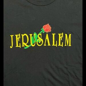 Vintage-style tee with “Jerusalem” in bold yellow text and a red rose graphic woven through the lettering.
