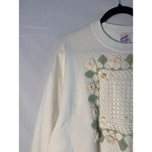 Vintage Jerzees Crochet Applique Grandma Core White Crew Neck Sweater Women's XL